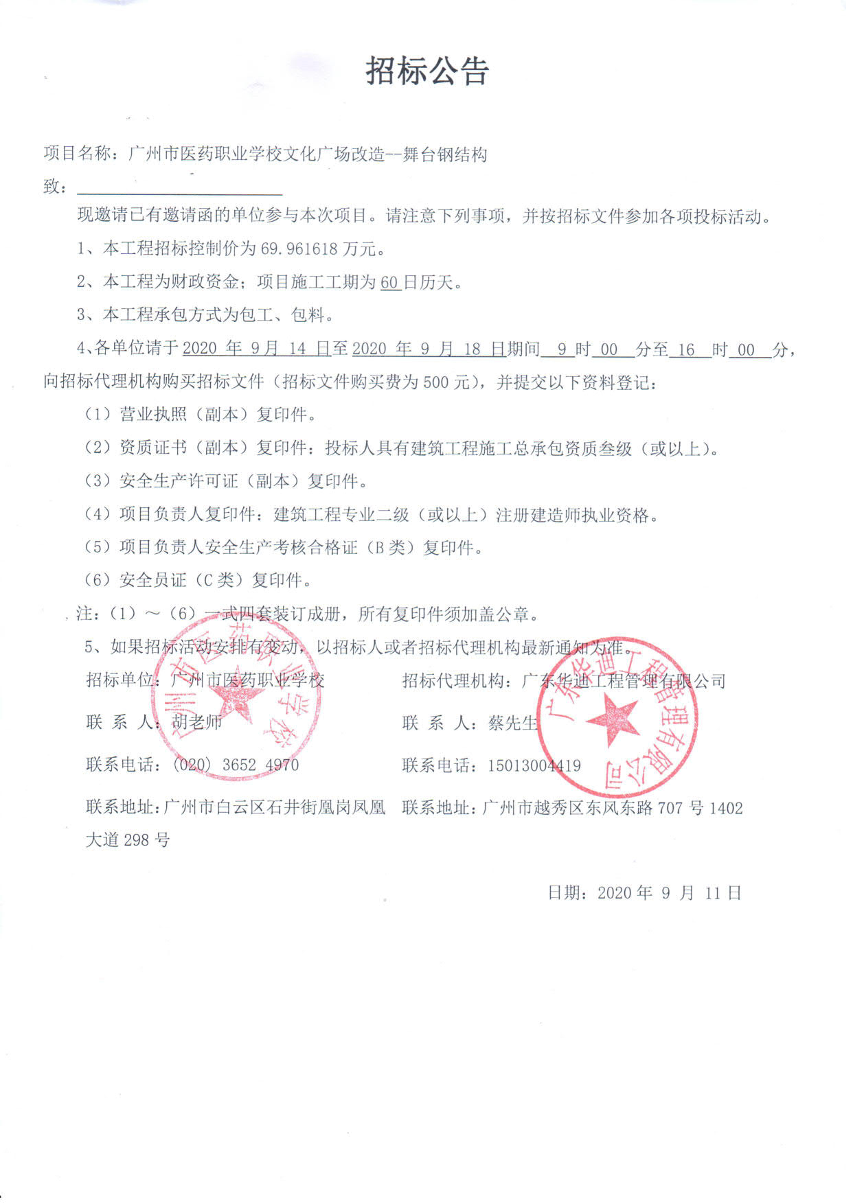 招標單位:廣州市醫(yī)藥職業(yè)學校 | 招標代理機構(gòu):廣東華迪工程管理有限公司 |